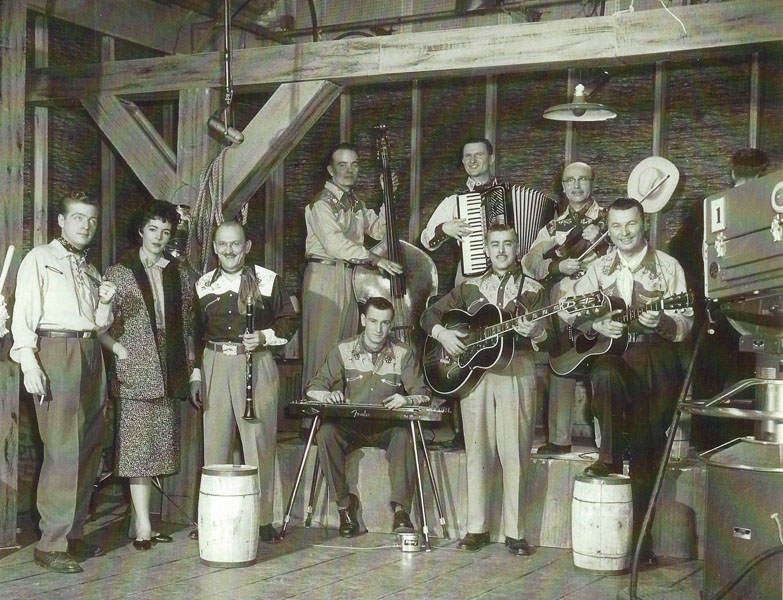 As a teenager born and raised in Ottawa, Ernie Hagar began his music career as a steel guitar player with the Cammie Howard Band. The band, pictured here at a 1956 taping of their CBC Radio show, featured the talents of (L/R) Paul Bayliff, Frances Burns (vocalist), Cammie Howard (clarinet), Marcel Lafortune (bass) Ernie Hagar (steel guitar) Karl Bohringer (accordian), Jean Lacroix (guitar), Gene Clouthier (fiddle) and Oral Scheer (guitar/vocals).