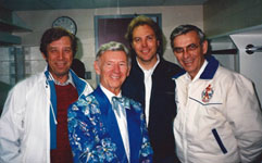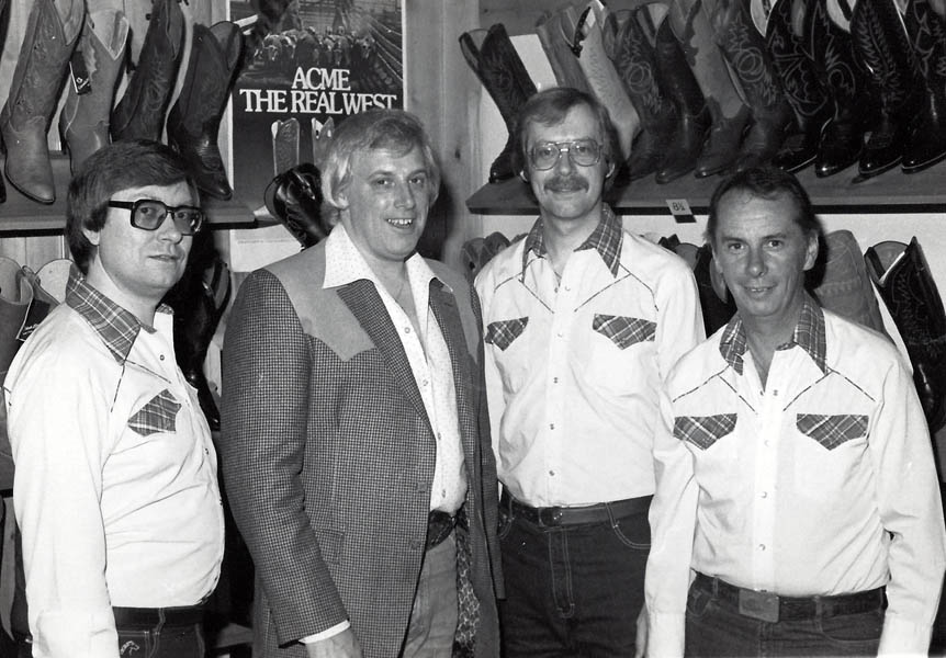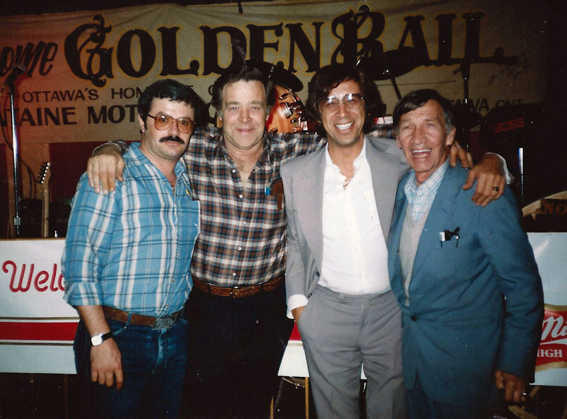Legendary Canadian country star and Hall of Famer Hank Snow, is greeted backstage at an Ottawa show date by three Ottawa Valley Country Music Hall of Fame inductees (L/R) Ted Daigle, (Hank Snow), Terry Carisse and Ron Sparling. All four country personalities are also inductees of the Canadian Country Music Hall Of Fame.
