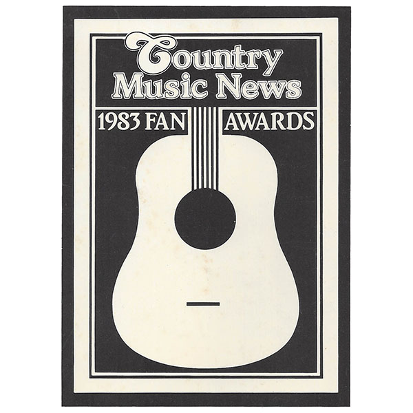 Front cover of souvenir program for the 1st Country Music News Fan Awards Show. The event was held May 1, 1983 at the National Arts Centre in Ottawa with 1700 fans and industry members attending. Hosted by Ronnie Prophet, the evenings entertainment featured performances by artists from all ten Provinces; and the production was deemed to be a benchmark for future Awards Shows presented by other music associations in Canada.