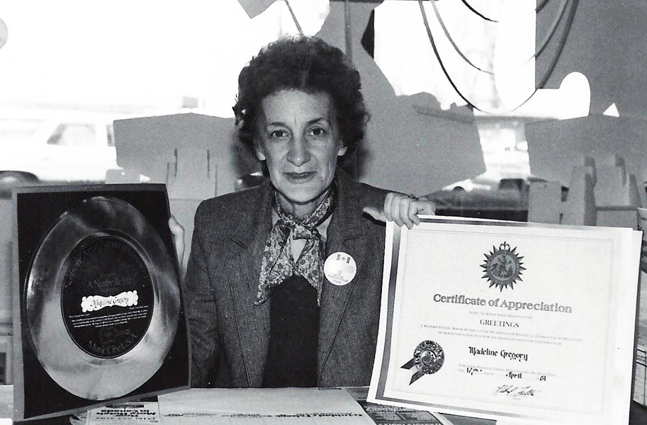 Madeline is pictured here in 1981 displaying special Awards of Appreciation from Nashville Chamber of Commerce, etc. for her many years of operating the Ramblin' Roads tour service. The tours to Nashville were often hosted by Hal "The Bear" Lee and CMN's Doug Torrance.