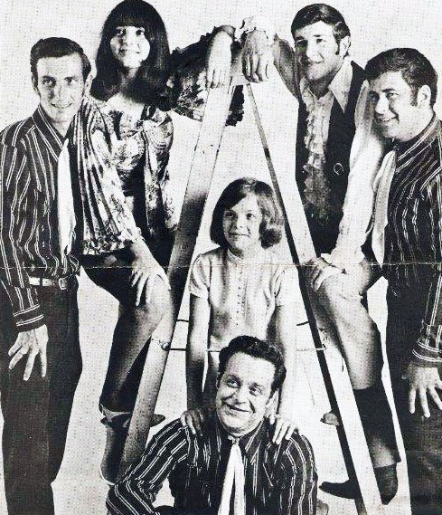 FAMILY BROWN early career promotional photo. (L/R) Ron Sparling, Lawanda Brown, Barry Brown, Dave Dennison with Tracey Brown and "Papa" Joe Brown under the ladder.