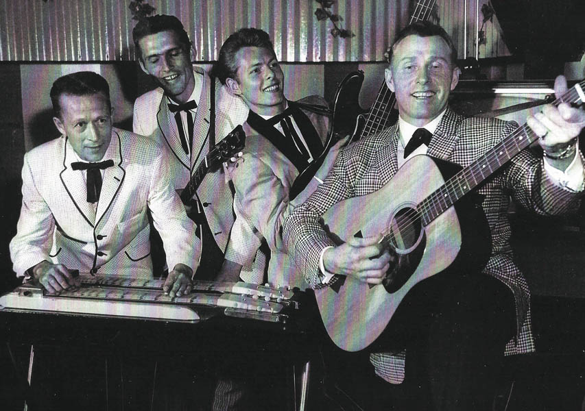 1985 Ottawa Valley Country Music Hall of Fame inductee Orval Prophet is pictured with his back-up band at a 1957 show date at the Monterey Club in Montreal. (L/R) George Essery, Rod Gordon, Andy Harvey and Orval Prophet. Steel guitarist George Essery was inducted into the Ottawa Valley Country Music Hall of Fame in 2001.