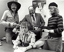 When Wayne Rostad founded his Stag Creek Records label, one of the first (and only) acts signed to the label was popular Ottawa Valley recording artist Neville Wells. Neville (seated) was "persuaded"" in the signing by (L/R) Wayne Rostad, his manager George Voisine and label Exec. Betty Whittington.